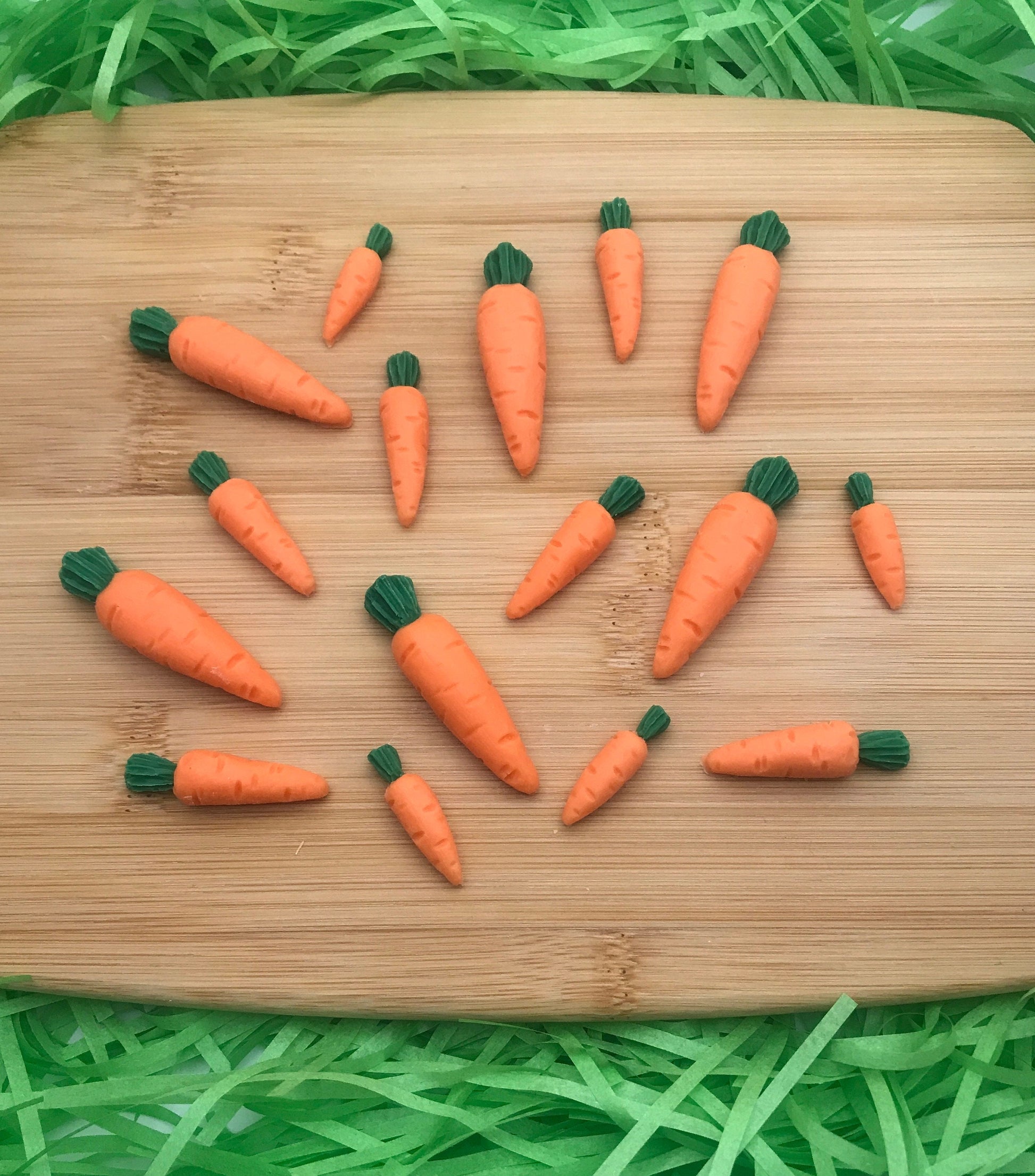 The variety of sizes allows for creative decorating possibilities. Use the larger carrots as focal points on cakes, medium ones for cupcake toppers, and smaller ones scattered around dessert tables or tucked into Easter baskets.