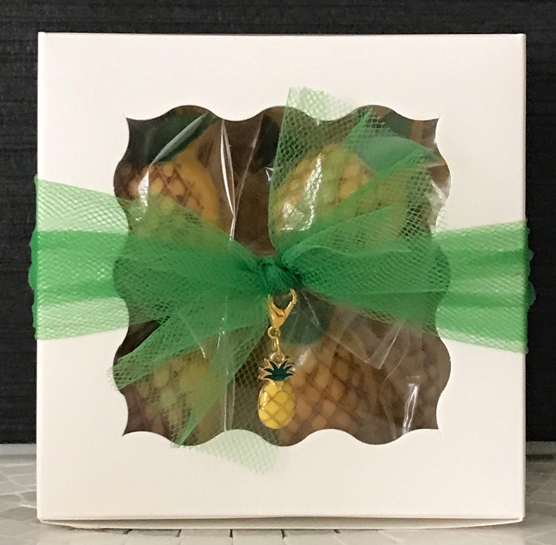 Beautifully presented in a white window box tied with an elegant tulle bow and crowned with a delightful pineapple charm, these chocolates make perfect gifts for pineapple lovers. Use them as adorable cupcake toppers to add tropical flair, or hand them out as memorable party favors.