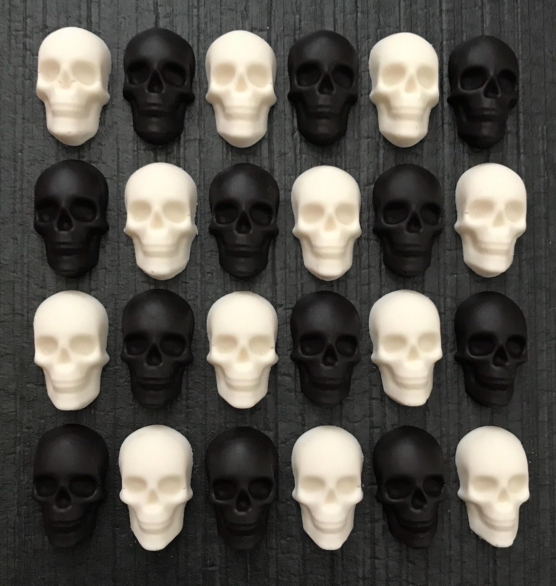 Delightfully adorable and delicious, these chocolate skulls are a must-have for any occasion. Crafted to perfection, they are versatile for cake decorating, adding flair to cupcakes, or the most wonderful gift for the Macabre loving person in your life. Whether you're hosting a themed party or simply craving a unique treat, these chocolate goodies are a perfect choice. Available in refreshing mint or classic vanilla and dark chocolate flavors, you can choose from mixed black and white or all of one color. Each piece, measuring approximately 1 inch, is made with high-quality Guittard white chocolate and Merckens black chocolate, ensuring a smooth and creamy taste that will leave your taste buds wanting more. Indulge in these delectable creations and add a touch of whimsy to your next celebration!