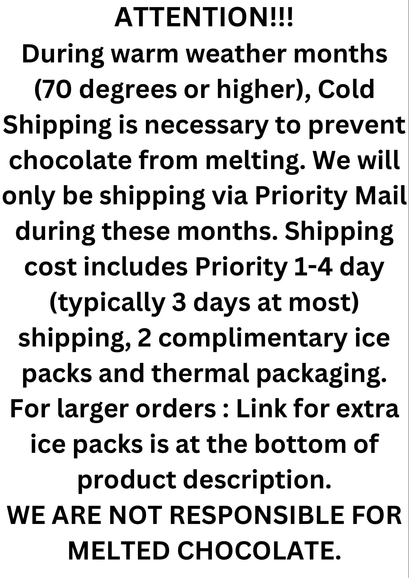 During warm weather months (70 degrees or higher), Cold Shipping is necessary to prevent chocolate from melting. We will only be shipping via Priority Mail during these months. Shipping cost includes Priority 1-4 day (typically 3 days at most) shipping, 2 complimentary ice packs and thermal packaging. If you feel that your order might require extra ice packs, please purchase them by clicking the listing link for ‘Cold Shipping ’ at the bottom of this product description. We would definitely recommend extra ice packs for larger/bulk orders.