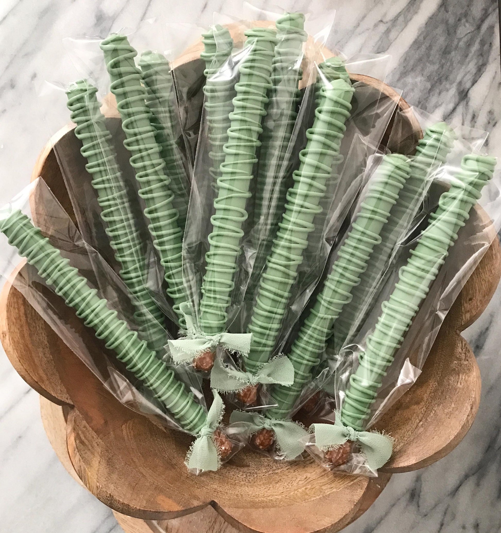 Made to order with premium chocolate and careful craftsmanship, these sage pretzel rods add a touch of sophistication and delicious flavor to your special day. The combination of beautiful presentation and quality taste makes them a memorable treat your guests will love!
